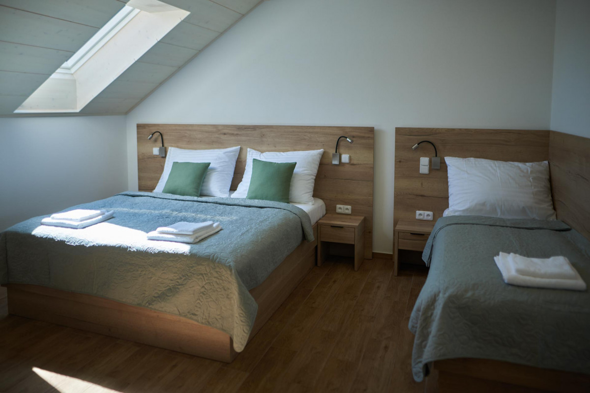 Praktický a přitom komfortní trojlůžkový pokoj s pohodlným king size lůžkem a samostatným jednolůžkem a vlastní koupelnou se sprchovým koutem a toaletou.