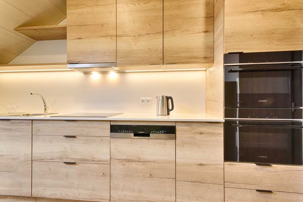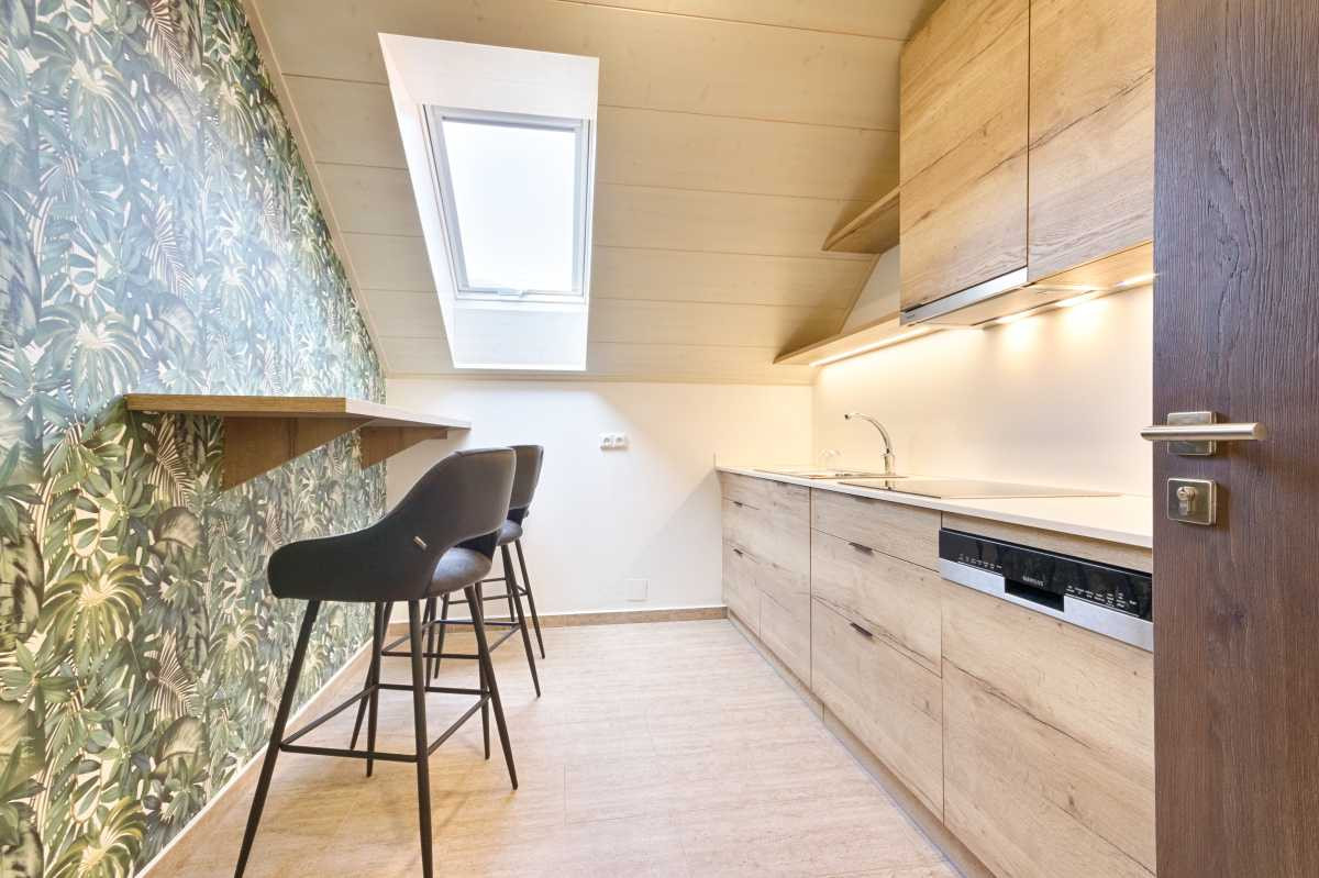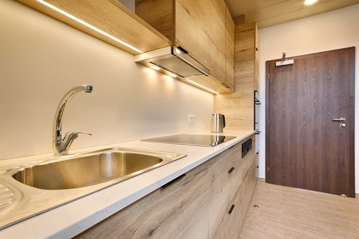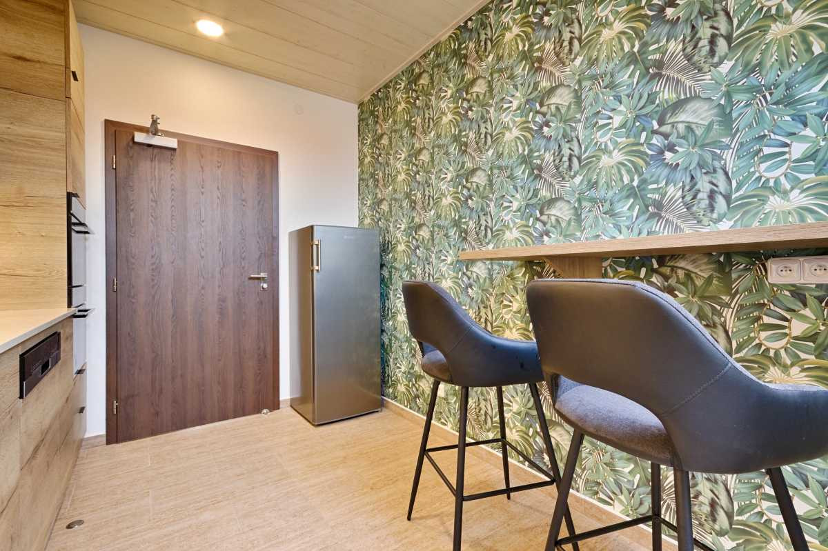 Hosté penzionu mají na patře společnou kuchyňku s lednicí, varnou deskou, troubou, mikrovlnnou troubou, rychlovarnou konvicí a nádobím.
